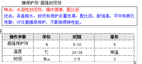 超强镍封闭剂,对形状简单的产品,封闭后镍层的耐中性盐雾能力可达24~48小时。